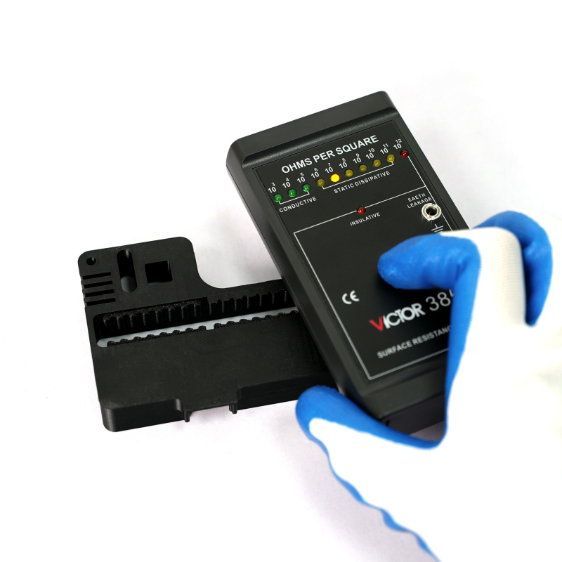 Dankzij additieven in het basismateriaal (ABS, PETG of PC) ligt de oppervlakteweerstand van het geprinte onderdeel binnen het bereik van ESD-veilige of dissipatieve materialen (10^5 tot 10^12 Ω/sq).