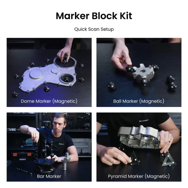 De markerblok-kit van de Advanced-versie verbetert de trackingstabiliteit en scancontinuïteit aanzienlijk, vooral bij grote of weinig gestructureerde objecten. Met magnetische bol-, dome- en piramide-markers, evenals bar- en 6 mm-markers, wordt het eenvoudiger om de scanomgeving te structureren en een nauwkeurige uitlijning van puntenwolken te garanderen.
