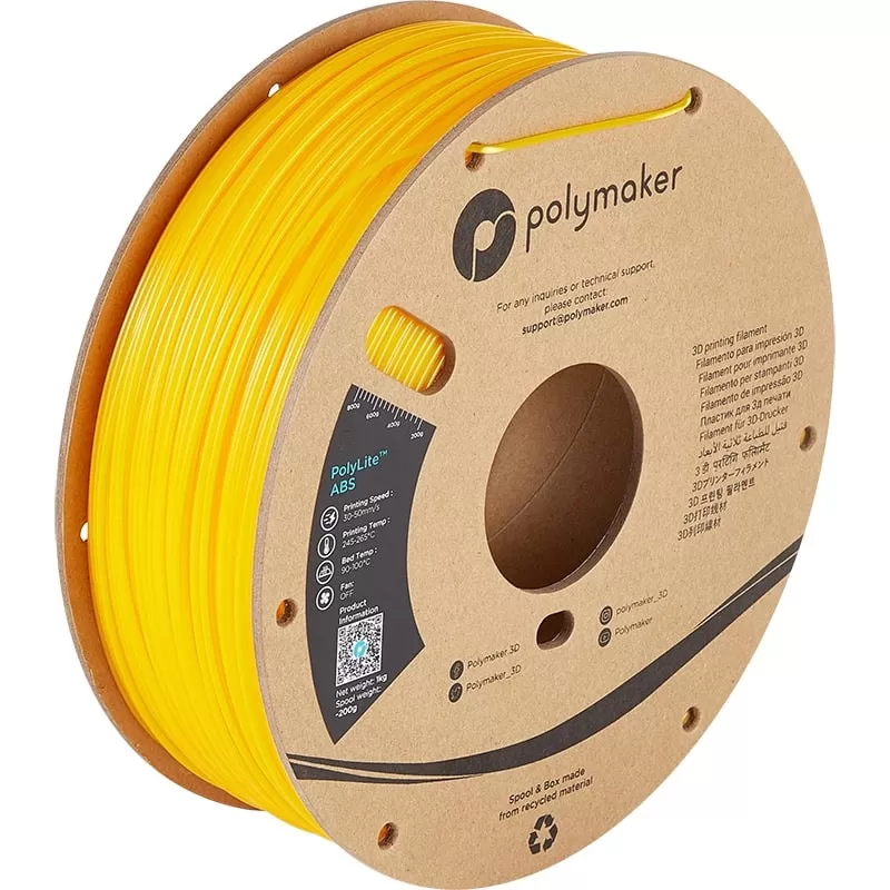 Het gele ABS-filament uit de PolyLite-serie, ontwikkeld door fabrikant Polymaker, is een hoogwaardig ABS-filament met een minimaal gehalte aan fijne deeltjes (VOS) om de schadelijkheid te beperken.