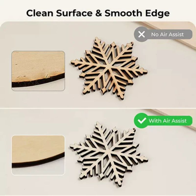 Deze druk blaast snijresten efficiënt weg, vermindert rookopbouw en verhoogt de prestaties op hout, leer en acryl.