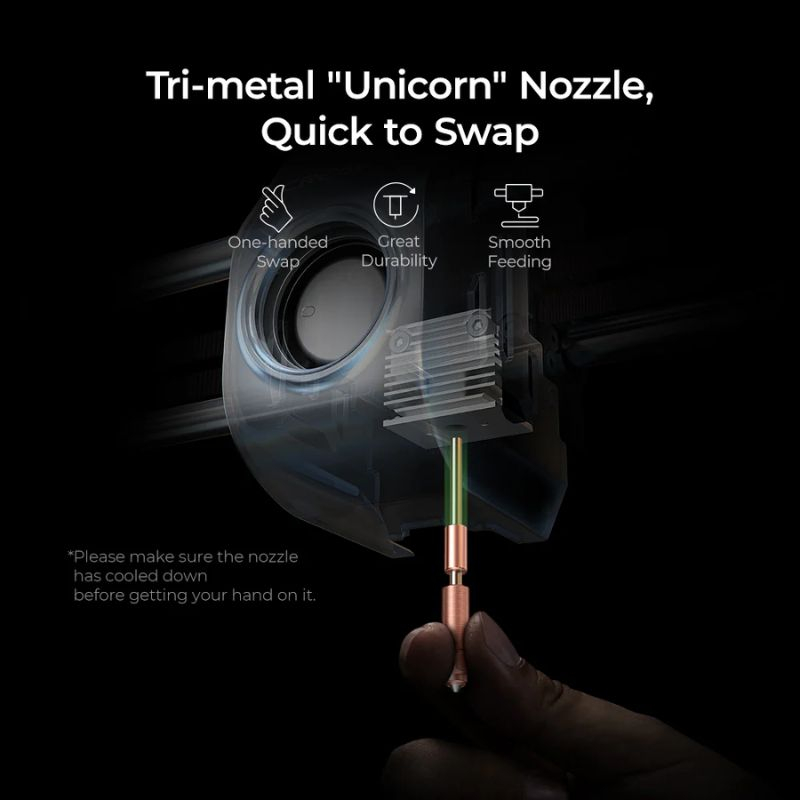 De snel verwisselbare nozzles maken het mogelijk om in enkele seconden van diameter of materiaal te wisselen. Dit vermindert stilstandstijd en beperkt bedieningsfouten, wat multimateriaal en meerkleurig printen vergemakkelijkt.