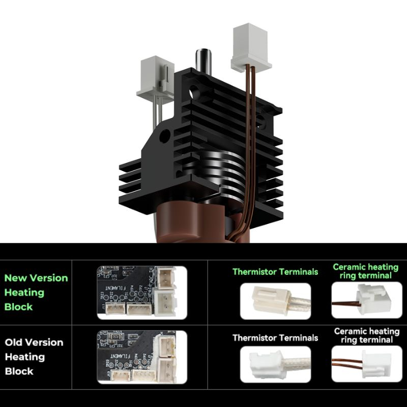 Met een geoptimaliseerde nozzle-kamer maakt dit verwarmingsblok een hoge extrusiestroom mogelijk (tot 32 mm³/s) en ondersteunt het printsnelheden tot 600 mm/s, ideaal voor high-speed printen. Het geïntegreerde volledig metalen ontwerp vereenvoudigt installatie, montage en nozzle-vervanging, terwijl het een lange levensduur biedt dankzij titaniumlegeringcomponenten en een koperen nozzle met geharde stalen punt.