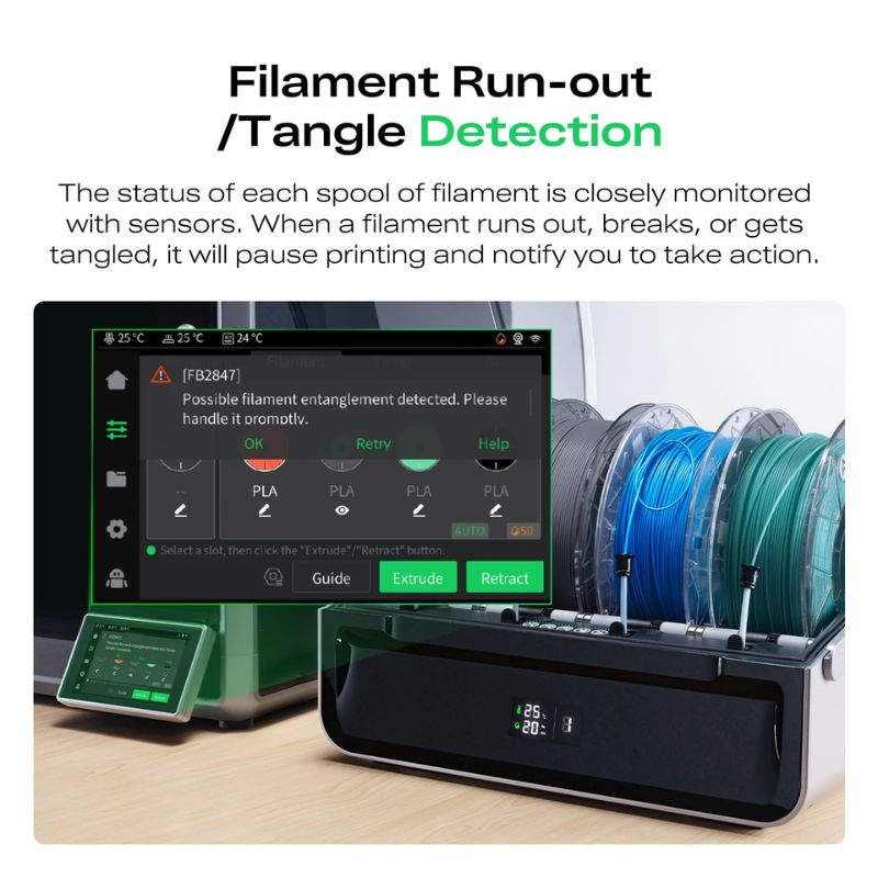 Geïntegreerde sensoren detecteren klitten of filament-uitval en pauzeren de print. Je wordt onmiddellijk gewaarschuwd bij problemen, waardoor je prints en hardware worden beschermd.