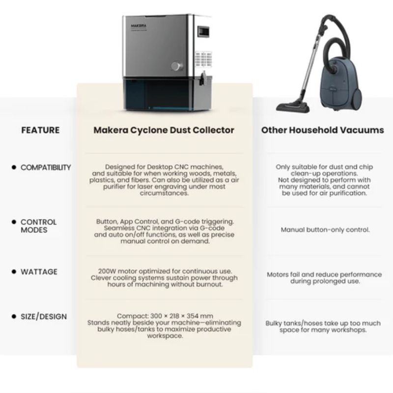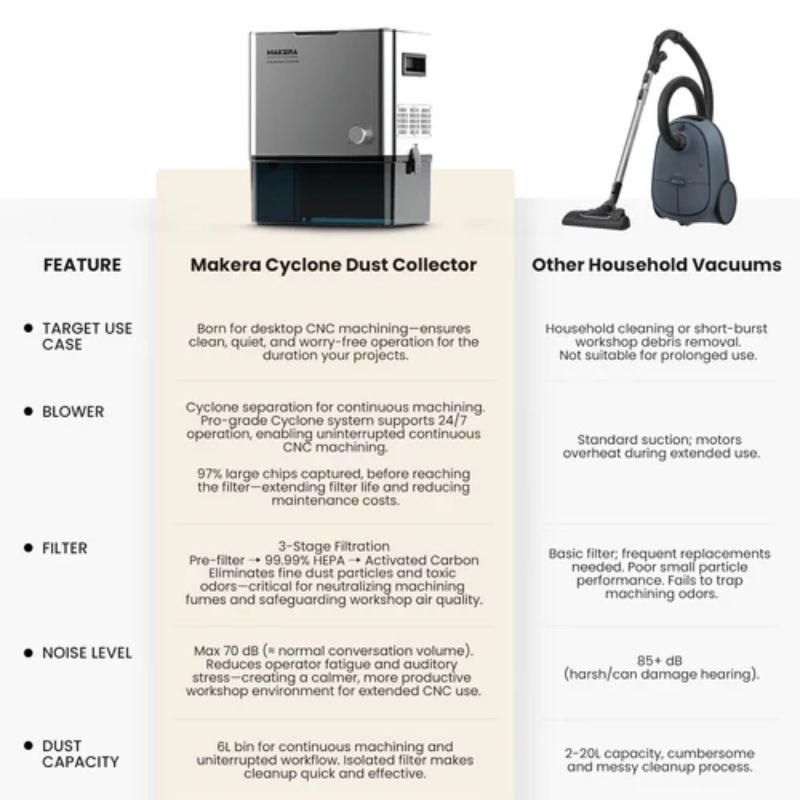 Het handhaven van een schone bewerkingsomgeving is essentieel voor de kwaliteit van onderdelen, de levensduur van de machine en de veiligheid van de gebruiker. De Makera Cyclone Dust Collector voldoet aan deze eisen met een efficiënt en stil ontwerp, geschikt voor compacte ruimtes. De combinatie van kracht, geavanceerde filtratie en compactheid maakt het een onmisbaar hulpmiddel voor elke desktop CNC-installatie die prestaties en reinheid wil combineren.