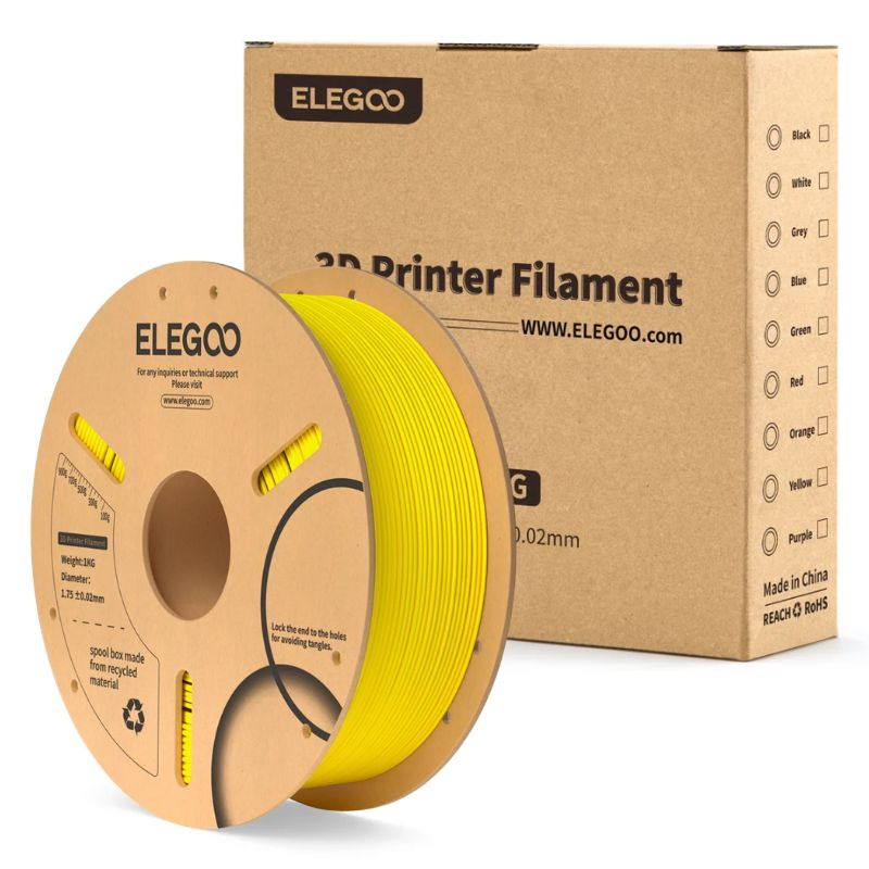 PLA Elegoo Geel Gemaakt van hoogwaardig , een veelgebruikt thermoplastisch materiaal, dat zich onderscheidt door zijn lage smelttemperatuur, gebruiksgemak, minimale vervorming en krimp, geen geuren tijdens het printen en een gladde, glanzende oppervlakteafwerking.