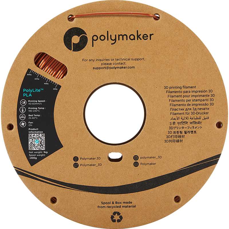 Printen met PolyLite Silk PLA is zeer eenvoudig. Aanbevolen extrusietemperatuur: 190–230°C en snelheid: 40–60 mm/s.