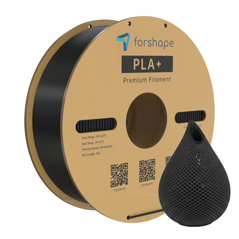 Het voldoet aan strikte normen zoals ROHS en REACH en is zeer gebruiksvriendelijk. PLA+ Zwart Forshape is licht gemodificeerd om stijver en slijtvaster te zijn dan standaard PLA-filamenten. De chemische eigenschappen maken het minder breekbaar.