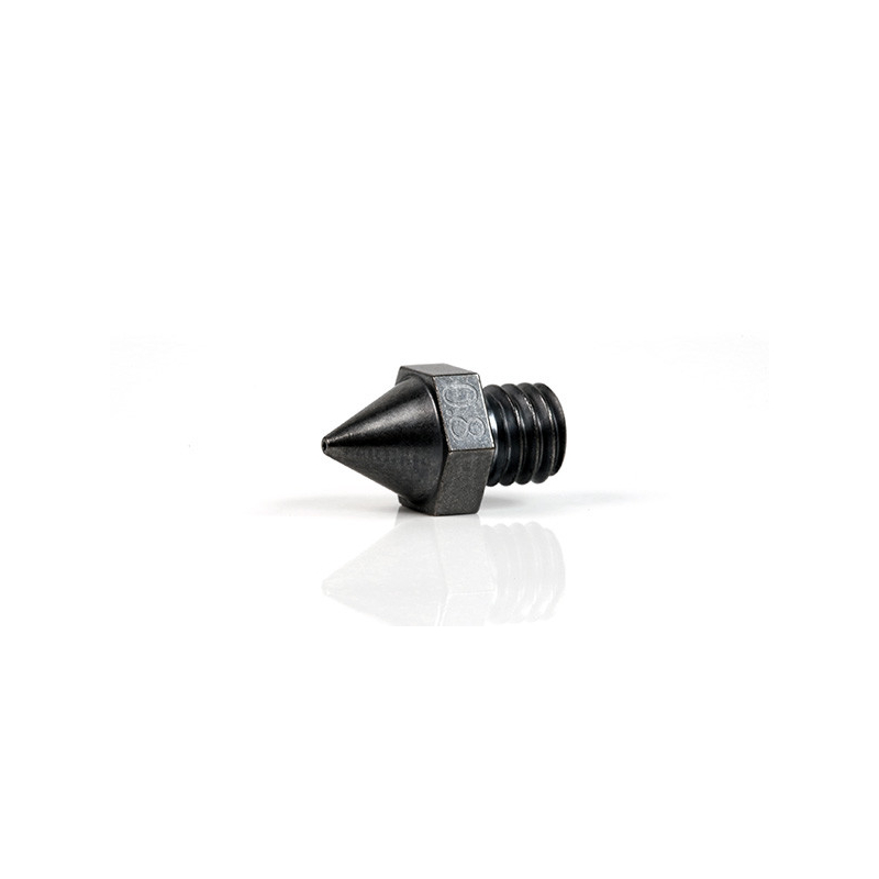 Staal met WS2-specifieke coating voor slijtage- en abrasiebestendigheid. Geschikt voor composiet- en abrasieve materialen. Licht verhogen van de temperatuur aanbevolen vergeleken met messing nozzles.