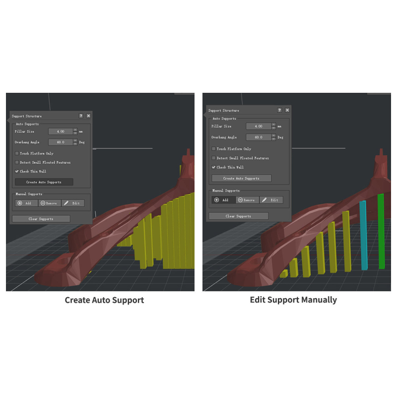 Les utilisateurs peuvent commencer à ajouter ou supprimer des structures de soutien en deux clics. L'interface utilisateur intuitive d'ideaMaker permet aux utilisateurs de traiter les supports en douceur, même à partir d'anges et de vues différentes.