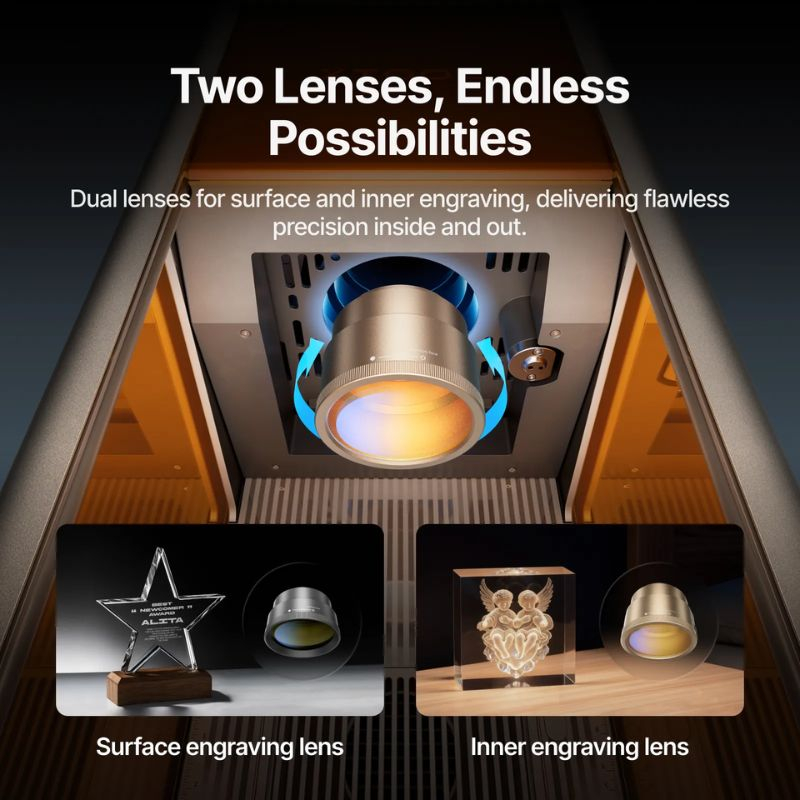 Voor interne gravures op glas of andere gevoelige materialen is een gebied van 70 × 70 mm beschikbaar, met verwisselbare lenzen die eenvoudig schakelen tussen oppervlaktegravure en interne gravure mogelijk maken.