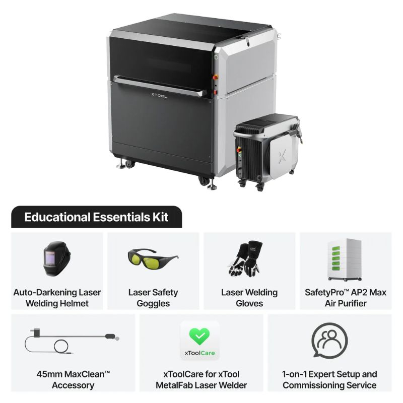 De xTool MetalFab 1200W Educational Essentials Kit combineert krachtig laserlassen, precisie CNC-snijden en volledige veiligheid met de xTool Safety Pro AP2 Max, een auto-darkening lashelm, een paar lashandschoenen en 1080 nm veiligheidsbril voor een veilige en gefilterde werkomgeving.